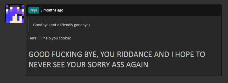 Bye nyx, kinda sad you didn’t put me in here ;/ hope you return once, I’ll be waiting. :CCCCC (cries)