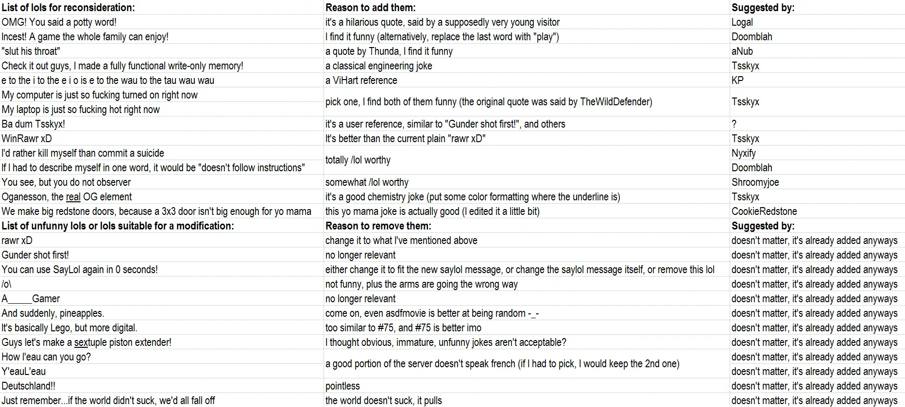 Also, let’s look at why it was denied and the accepted afterwards: The lol was voted 1/1 between Logal an Llama, who are the deciding instance in this. The lol was voted 11/5 (70% yes) by the community. Three people then starting ranting about how it confuses them and they don’t get it (fun fact: The point of an entirely random lol is that it’s funny because it’s random and confusing), leading to llama being annoyed by those three people and closing the lol to prevent further discussion.