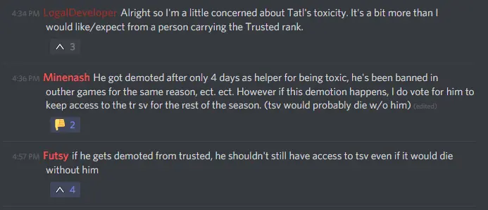 - Evaluated after an appropriate amount of time So, every staff member was properly informed and had the chance to vote on it. The two missing votes are Doomblah, as they have taken an announced and planned break during the time where it happened, and me. I did not vote on the poll because I just recently came back, I don’t see how my vote as an admin is all too much of a concern in a vote about trusted rank, as my job is to be there and fix things that break. Not communicate with people and deal with their behaviour. My vote would have been a no towards the demotion, but it would not have changed the result of the vote, and as I have reasoned above, I do not see me in a position where I should vote on it in the first place.
